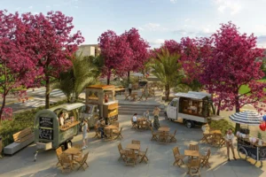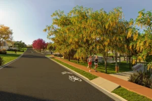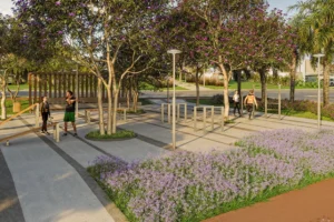 🌳 Boulevard com ruas arborizadas, pergolados e bancos